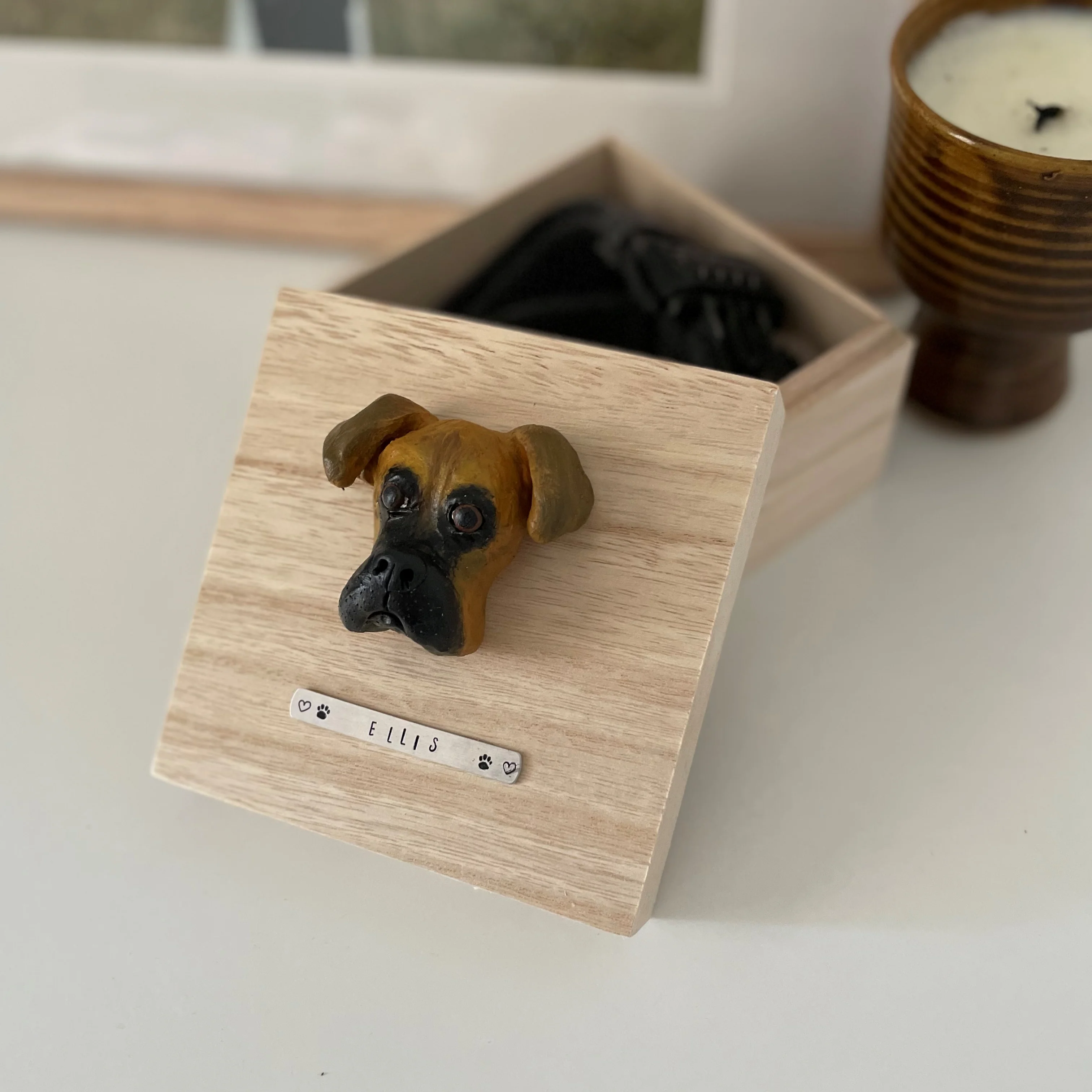 This custom created pet memorial box is crafted with unfinished timber, featuring a polymer clay sculpted pet face. The artist creates each item from scratch, using clay to immortalize unique facial features of your pet. The item is further customised by adding a hand-stamped aluminium name label underneath the clay face sculpture. This unique memorial keepsake offers a charming way to store the ashes or collar of a beloved pet.