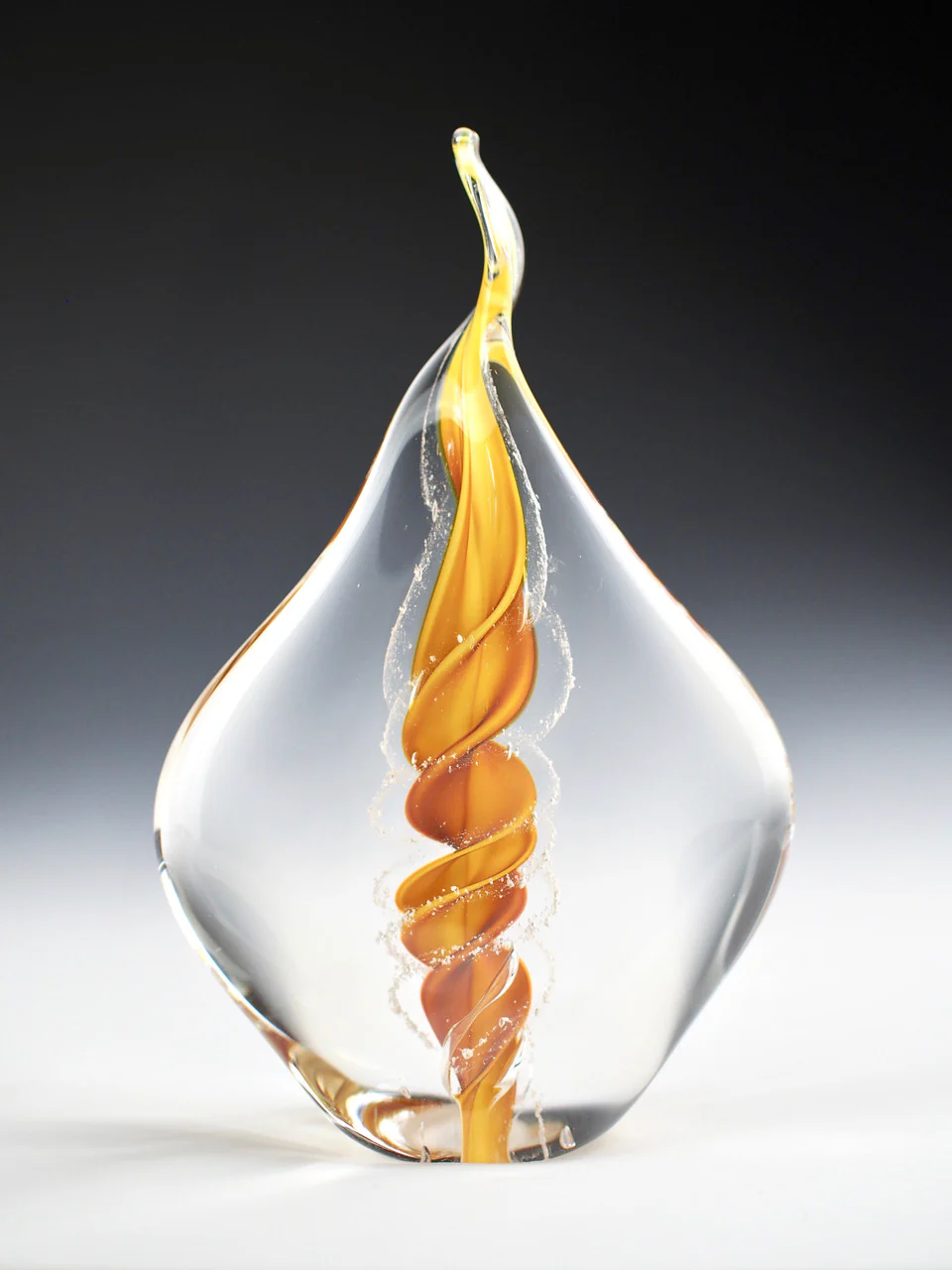The Eternal Flame Paperweight is one of our favorite designs, encapsulating your loved one's spirit in a swirl of color. Crafted from molten glass, this memorial is both a tribute and a work of art. Available in two sizes, it requires only a 1/4 teaspoon of ash. Optional engraved bases and handwritten inscriptions offer a personalized touch.