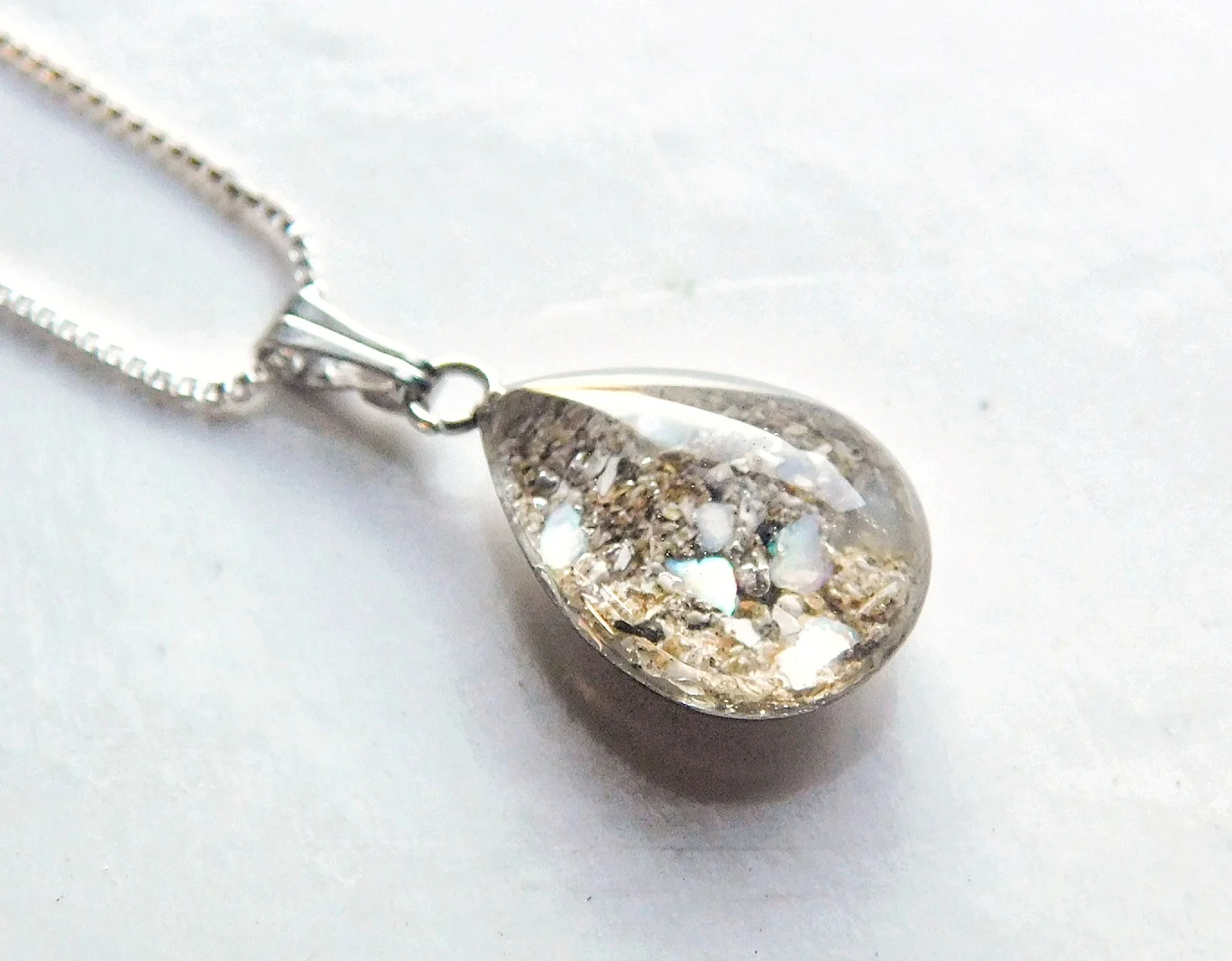 The pear-shaped glass stone elegantly showcases your loved one's ashes, capturing their beauty in a radiant manner. This pendant serves as a timeless symbol of your enduring connection and the precious memories you shared.