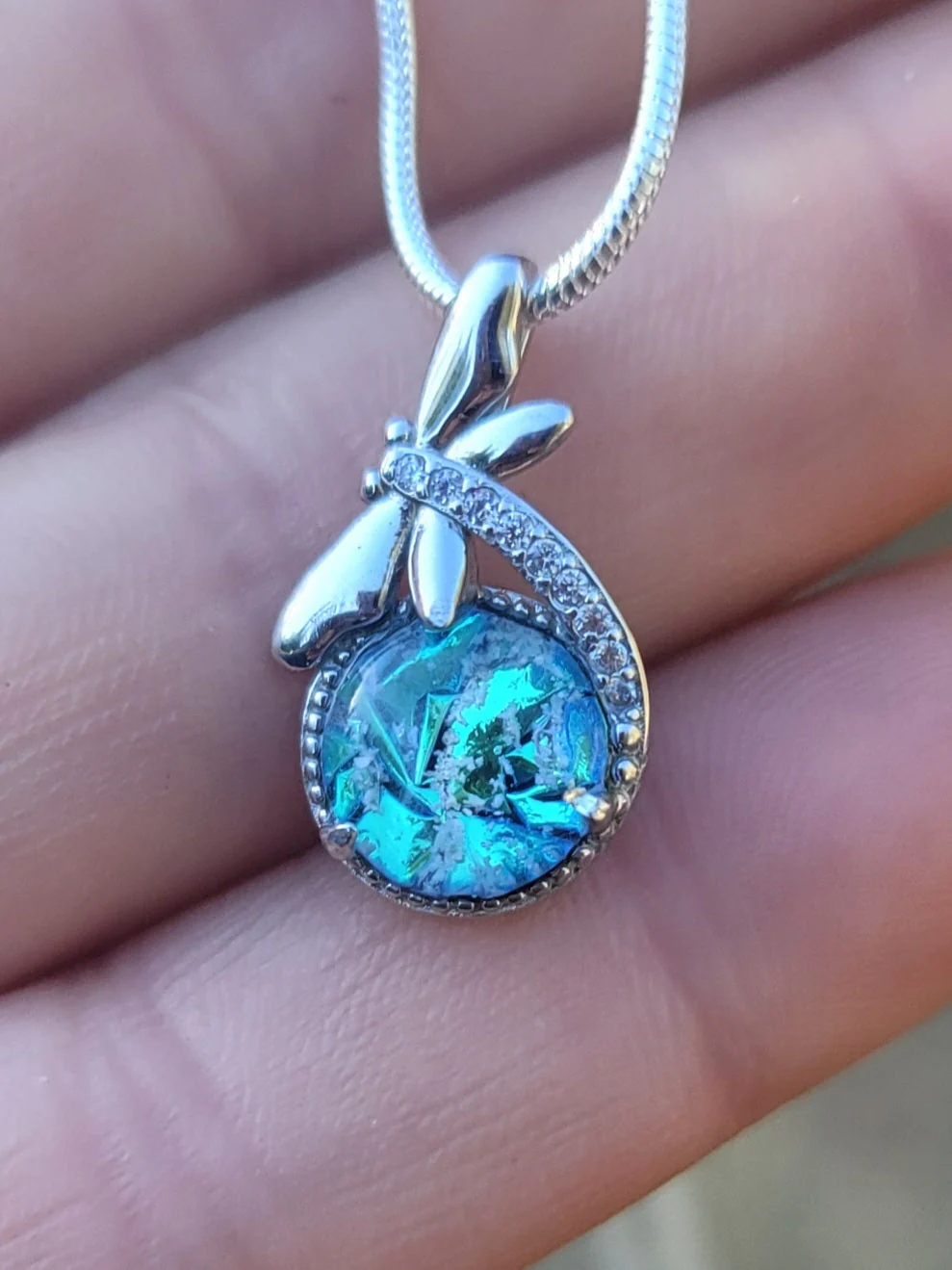 The pendant's bottom has a lovely blue stone that exudes tranquility and peace. It also is infused with your loved one's ashes, making it a one of kind momento.